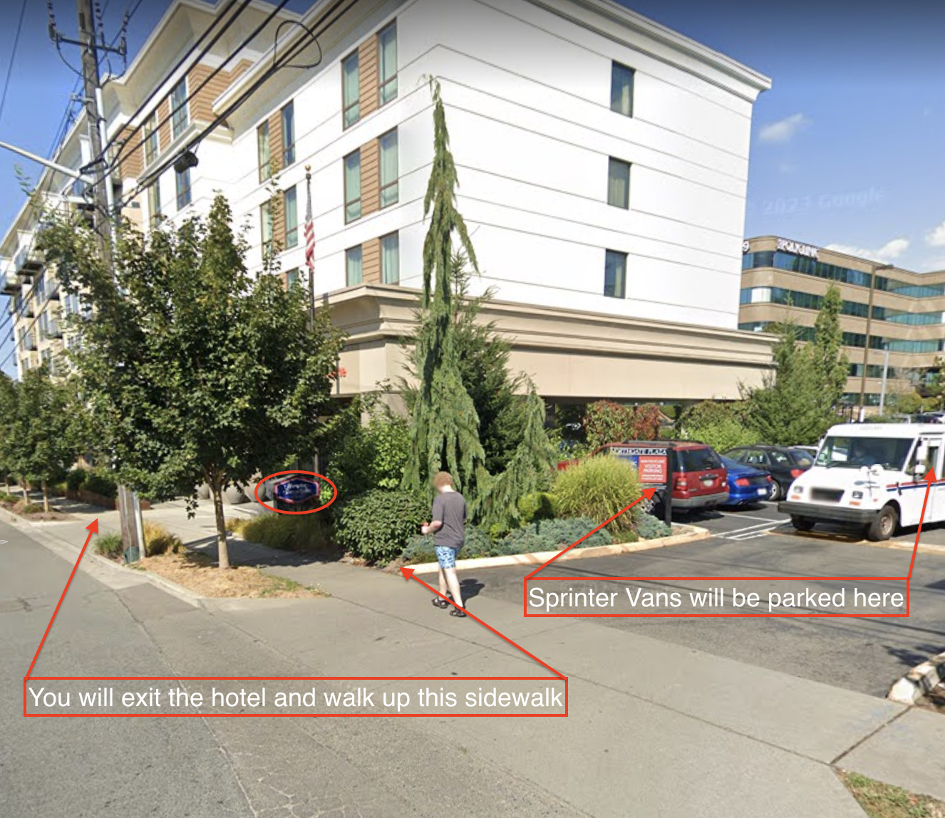 We are booking 4 Sprinter Vans which seat 14 people each to transport people from the Hampton Inn in Northgate to the venue. Unfortunately, we cannot do larger shuttles due to incline and turning-radius restrictions at the venue. Those shuttles will be departing from a parking lot adjacent to the hotel: